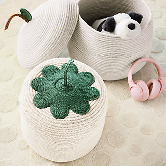 Crate & Barrel Kids also has storage solutions for new parents. Our nursery storage baskets, for example, can be placed right beside your changing table for easy access to wipes, diapers and extra changing pad covers. For a simple yet coordinated look, consider a set of woven nursery baskets instead, or go for baby storage bins that complement the nursery's theme—a whale-shaped basket sets the tone in a sea-inspired nursery, while a giraffe bin is a fun addition to your baby's safari theme.