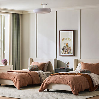 Go beyond the basics when finding the ideal baby, toddler and kids' furniture when shopping Crate & Kids in-store or online. Not only does selecting new children's furniture, like twin beds, homework desks and kid-friendly dressers help enhance the look of their space, it also means more comfort and practicality for the entire family. Looking for cute baby furniture that makes a seamless transition from the nursery to the big kid bedroom? Peruse our convertible nursery cribs that effortlessly transition from standard baby crib to toddler- or twin-size bed once your little one is old enough. For parents who want kids' furniture that helps with bonding, consider a kids' bookcase, too. It holds all their favorite bedtime stories, and when they start school, their bookcase will also keep textbooks within reach as they sit at their study desk on school days. Still looking for modern baby and kids' furniture ideas from Crate & Barrel Kids? Read on to discover the best options by room.