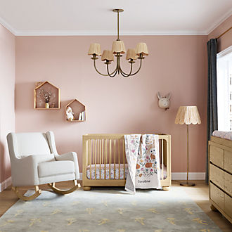 Want to bring baby home to a comfortable space that fosters growing and learning? Let Crate & Barrel Baby help with a crib that anchors the nursery. Standard baby cribs are ideal for families that want to keep it simple, while nursery cribs with spindles or curved frames spruce up the space. No matter your family's preferred aesthetic, neutral hues of beige, black and white complement any theme, while bolder shades of red, green and pink add more whimsy. For parents who want their newborn to sleep nearby for the first few months, consider a bedside bassinet instead. Plan on making a lot of trips to Grandma and Grandpa's house? Get a travel crib as well, to help keep naptime on schedule. Don't forget nursery furniture for yourself—a swivel glider chair with matching ottoman helps keep everyone comfortable while nursing, and a dresser with changing table topper makes diaper changes easier.