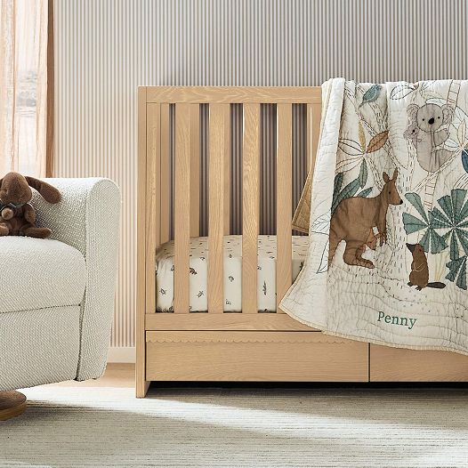 Want to bring baby home to a comfortable space that fosters growing and learning? Let Crate & Barrel Baby help with a crib that anchors the nursery. Standard baby cribs are ideal for families that want to keep it simple, while nursery cribs with spindles or curved frames spruce up the space. No matter your family's preferred aesthetic, neutral hues of beige, black and white complement any theme, while bolder shades of red, green and pink add more whimsy. For parents who want their newborn to sleep nearby for the first few months, consider a bedside bassinet instead. Plan on making a lot of trips to Grandma and Grandpa's house? Get a travel crib as well, to help keep naptime on schedule. Don't forget nursery furniture for yourself—a swivel glider chair with matching ottoman helps keep everyone comfortable while nursing, and a dresser with changing table topper makes diaper changes easier.