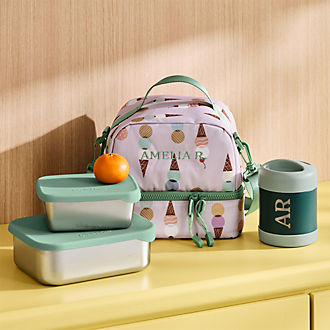 When it comes to packing meals for your children's day at camp or school, the kids lunch boxes at Crate & Kids keep their food fresh until it's time to eat. Made of recycled materials, each soft-sided lunch box for kids is featured in favorite colors, patterns and whimsical designs that speak to your little one's personality. Not only do our school lunch boxes have a roomy interior, an adjustable and removal divider, padded handle and exterior pocket (perfect for napkins) but they also act as insulated lunch boxes for kids that keep their food at-temperature until snack time or lunchtime rolls around. For a truly unique personalized lunch box for kids, you have the option to get your child's name, initials or a nickname embroidered on the front. You get your choice of font and thread color. To achieve a coordinated look, be sure to find a cute lunch box for school that matches the designs on our Crate & Barrel kids backpacks, stainless steel water bottles and pencil cases.