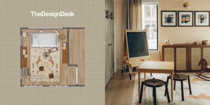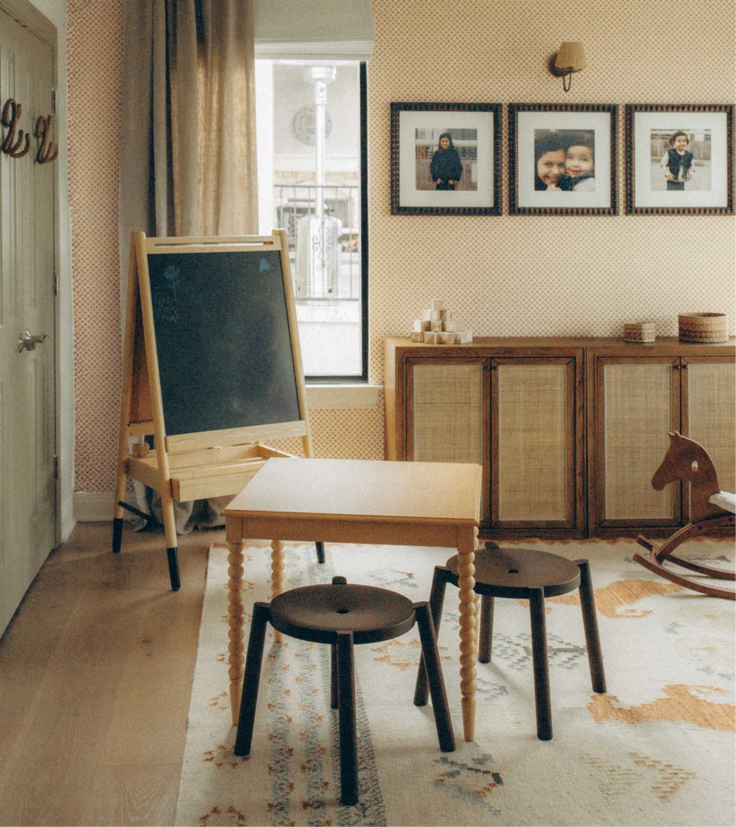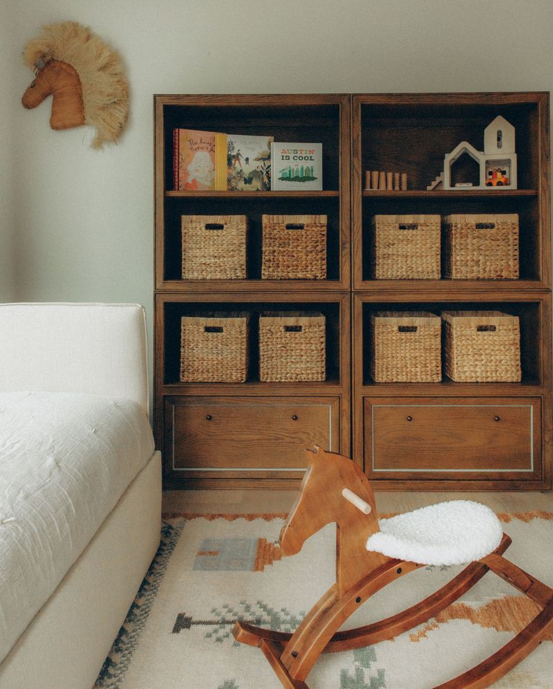 The key to Odette's design lives in the thoughtful details that make daily life easier. For example, her choice of ample and accessible toy storage ensures that cleanup is a breeze for little hands and the inclusion of play tables and chairs offer a dedicated zone for arts and crafts. Her choice of playroom rug is highly durable—readily standing up to all-day play—and the toys in the room, like Jellycat stuffed animals, a rocking horse and dollhouse keep both her children entertained. Eye-catching kids wall art adds the final touch, elevating the room's function without sacrificing its warmth.