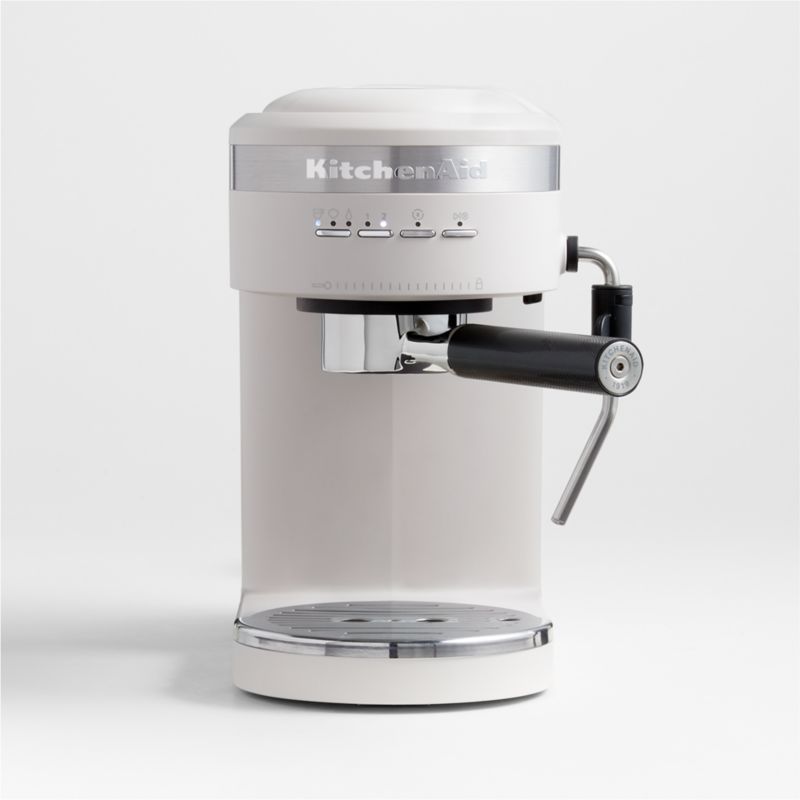 Craft cafe-quality macchiatos, lattes, mochas and more with this KitchenAid semi-automatic espresso machine that simplifies commercial processes for home use. The fast-heating thermocoil technology heats water up to the ideal brewing temperature in less than 40 seconds, and dual smart temperature sensors maintain that temperature shot after shot. A flat-bottom portafilter offers stability for even tamping, and the powerful pump provides optimal pressure. The steam wand froths milk to finish off your drink with silky foam. For a coordinated coffee station, pair the espresso machine with the matching coffee grinder in a milkshake-inspired warm white (sold separately)