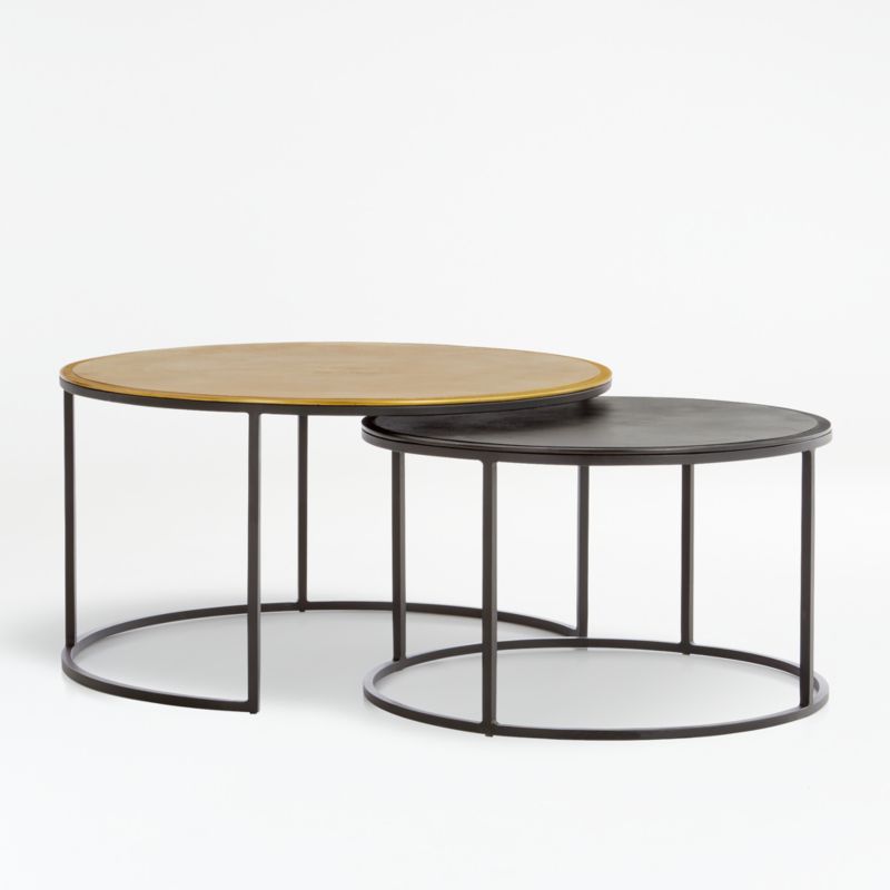 The tables' open frames have a ringed tripod base that supports textured sand-cast-aluminum tops, enhanced with an antiqued finishes. This small antiqued bronze table pairs tucks under the larger brass table for a two-tiered, two-toned look. Due to their handcrafted nature, tables may vary in surface texture. The Nesting Coffee Tables Small and Large Set is a Crate and Barrel exclusive.