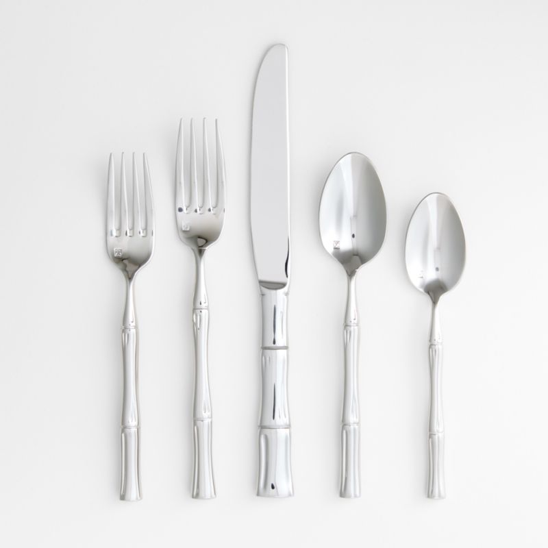 Our Kyoto flatware takes inspiration from the distinctive look of bamboo. Subtly detailed to evoke the plant's distinctive segmented stems, the stainless steel utensils balance unexpected whimsy with sleek and graceful modern design. The mirror-polished flatware boasts exceptional durability, and the generous weight feels well-balanced in hand. This 20-piece set includes four place settings, each with a teaspoon, dinner spoon, salad fork, dinner fork and dinner knife.