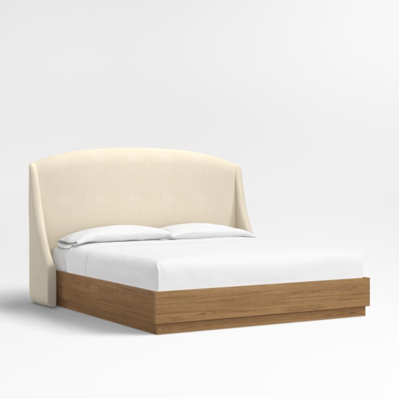 Our custom bed collection lets you mix and match our top-selling headboards and bases for a look that's truly yours. The Lafayette tall headboard gives your bed the sumptuous curves of a French-style chaise with a rounded top and sloped wings. Upholstered in an ivory bouclé weave, the elegant headboard pairs beautifully with the Batten bed base, which features a sleek plinth design and the lively grain of oak veneer enhanced with a smoke grey finish.