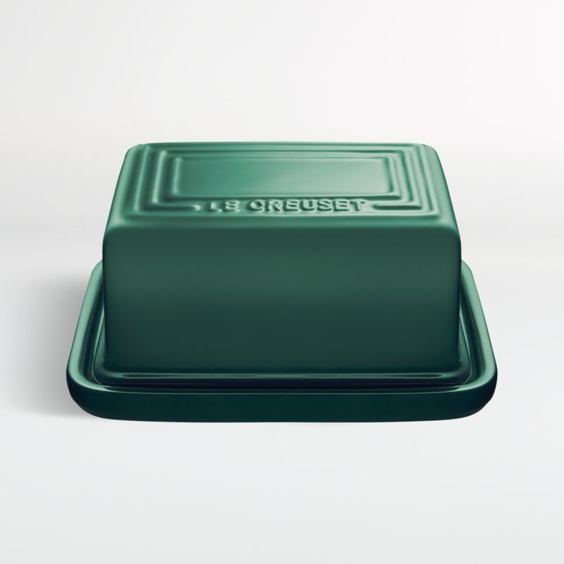Managing to look both modern and retro, this butter dish is glazed artichoke green. The generously sized stoneware dish is designed to accommodate a one-pound block of butter. Decorative yet functional, the covered butter dish goes from refrigerator to countertop for cooking or to table for serving. Stain- and chip-resistant, the dish also protects from odor absorption for fresh-tasting butter.