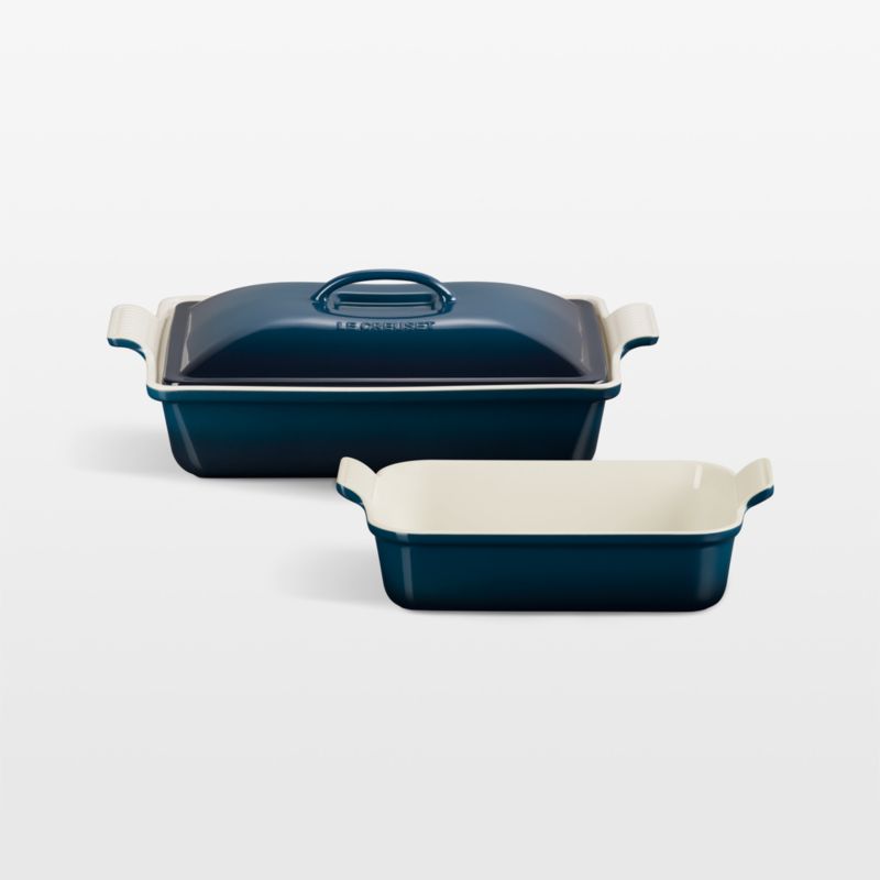 Based on vintage designs in the Le Creuset archives, the Heritage line of ceramic bakeware provides superior heat distribution and temperature retention. This three-piece set includes two rectangular baking dishes—a 2.3-liter baking dish and 3.8-liter casserole with lid. Glazed midnight-inspired blue, the stoneware dishes in the set resist scratching, staining, cracking and crazing. Nearly non-stick interiors effortlessly release food and clean up easily.
