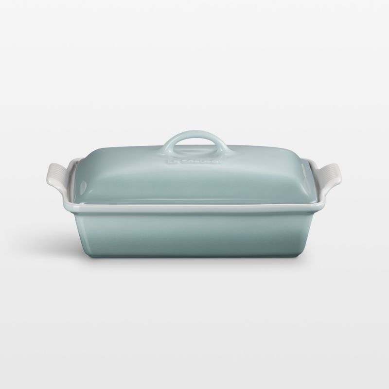 Enamel in warm blue-green glazes this gorgeous covered casserole. Based on vintage designs from Le Creuset's early days, the baking dish features traditional styling with scalloped handles. Crafted of dense stoneware, the rectangular pan blocks moisture absorption to prevent cracking and crazing. The nearly non-stick interior resists sticking, effortlessly releases food and cleans up easily. Ideal for baking and serving fruit crumbles, lasagna and more, the lidded baker goes beautifully from the oven to the table.