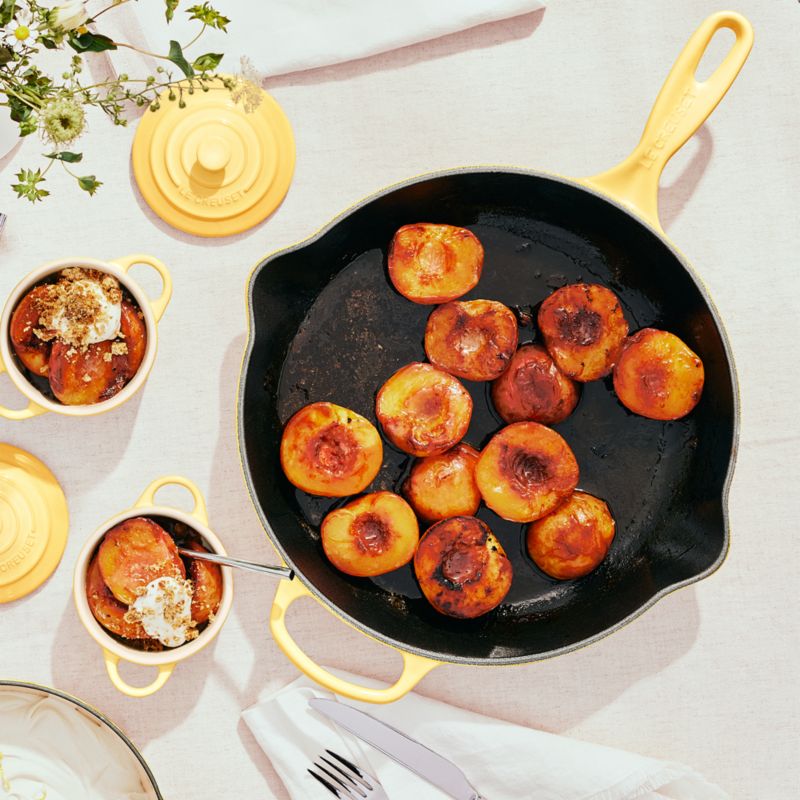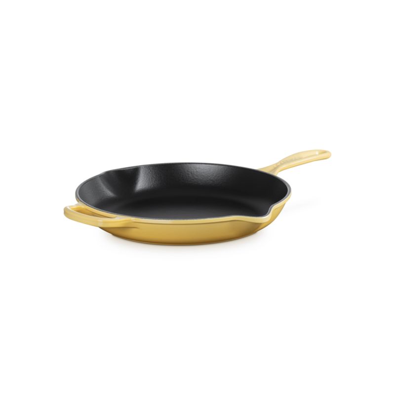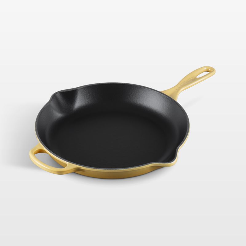 Enamel in a sunny yellow inspired by the center of a chamomile bloom coats this cast iron skillet with a smooth, shock-resistant finish that's impervious to acid, alkali, odors and stains. Formulated to work with higher temperatures, the black non-reactive cooking surface does not require seasoning. Equipped with a helper handle, the frying pan moves easily from the oven or stove to the dining table.