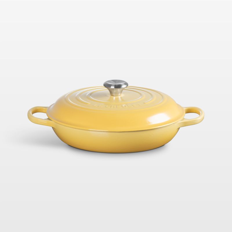 Brighten up your kitchen with this braiser enameled in a sunny yellow inspired by the center of a chamomile bloom. Beautiful to look at, the glaze gives the pan a smooth, shock-resistant finish that's impervious to acid, alkali, odors and stains. Crafted with a specially designed "all-round" lip for drip-free pouring with either hand, the braising pan features a close-fitting lid that creates a blanket of heat for even cooking and superb braising. The lidded pan is compatible with all types of heat sources, from gas and induction stoves to outdoor grills.