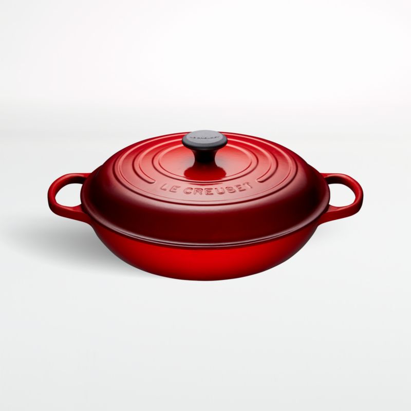 Revered by both professional chefs and home cooks since its 1925 debut, Le Creuset's classic French cookware is prized for its utilitarian good looks, unsurpassed heat retention, and lids that create an even "blanket" of heat. Cast iron is clad in smooth enamel in kitchen-friendly cherry red, rendering each piece impervious to acid, alkali, odors and stains. These cerise braiser pans are perfect for family-size stews, paella or rice. Their non-reactive cooking surface does not require seasoning and braises to perfection with wet or dry cooking methods. Compatible with all types of heat sources, from gas and electric stoves, to ceramic and glass cooktops, to induction and halogen, the lidded pan is topped with a black knob.