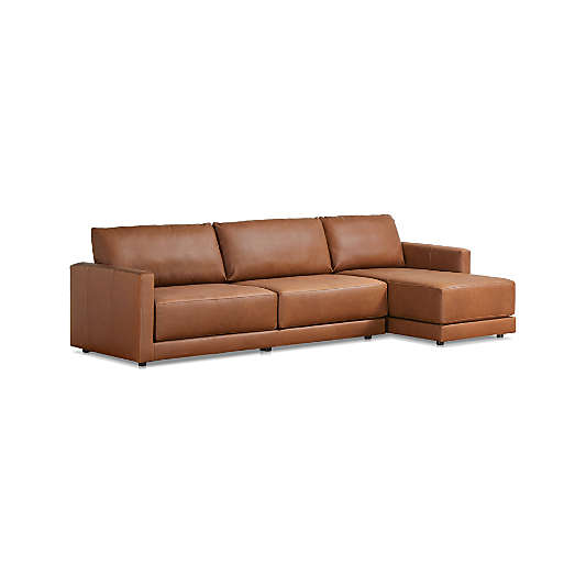 A leather sectional from Crate and Barrel is a beautiful addition to your living room. Our sectional loveseats and sofas blend casual comfort and on-trend style. From classic to mid-century modern, we have a full range of sectional options from which you can choose. Browse complete sectionals in a variety of rich, beautiful upholstered leather grains. We also offer sectionals with left- and right-facing chaise lounges so you can kick back and relax in your comfortable sofa. Our sectional sofas are constructed from sustainable hardwood, soy-based polyfoam seat cushions and exceptional leather upholstery designed to last for years in your home. In addition to sectional sofas, we also offer other leather furniture for your rooms, including accent chairs, office chairs, sleeper sofas, dining room furniture and more. Shop our selection of leather sectional sofas in traditional and modern designs.