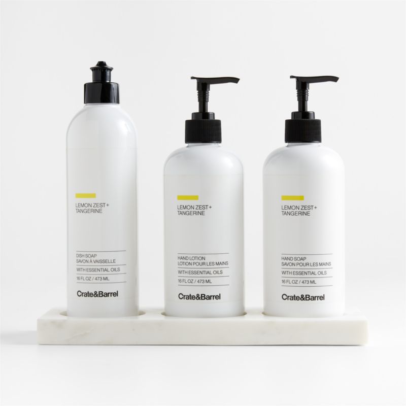 Wash dishes and clean and soothe hands with the sweet, bright fragrances of lemon zest and tangerine featured in this exclusive four-piece set. Our dish soap tackles grease and residue with ease. Once the dishes are done, our hand soap moisturizes with sunflower seed oil and aloe vera as it cleans, while the hand lotion boasts mango seed oil and aloe. All three are made with plant-based formulas scented with essential oils that leave behind a fresh, clean aroma of lemongrass and geranium against a backdrop of zesty citrus. Cut, finished and polished by hand, the white marble caddy keeps the bottles right at hand while looking neat and stylish.