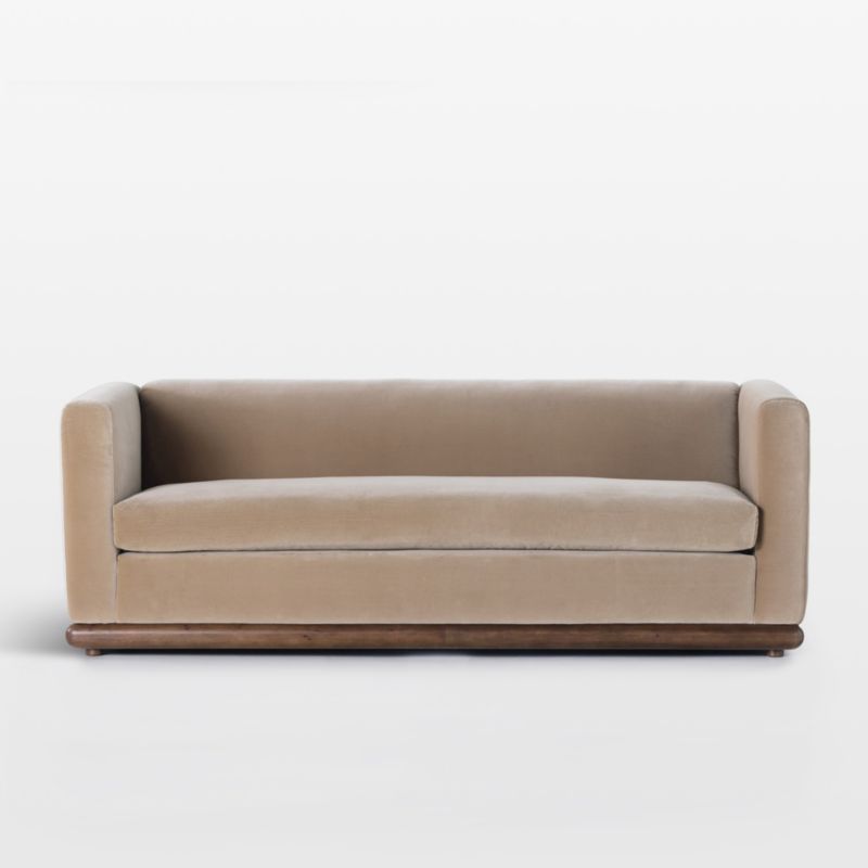 A fresh take on 1930s opulence, Art Deco-inspired Lincoln courts comfort with clean lines and luxurious velvet upholstery in warm taupe. Waterfall armrests invite draping, while the low back keeps sightlines clear. Filled with a sumptuous feather and fiber blend, the pillow cushion offers a plush seat and reverses to keep the look fresh and well tailored. A hardwood plinth base adds organic interest and sophisticated contrast to this eye-catching sofa.