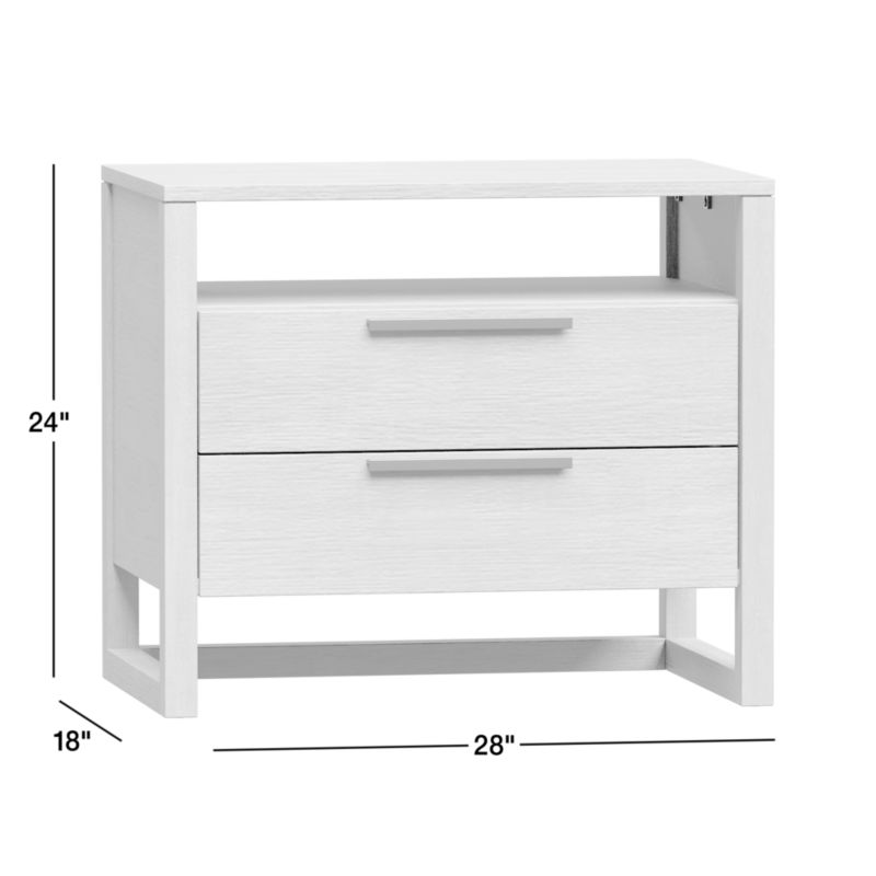Linea's clean, linear styling puts the focus on solid teak, left unfinished to show off the wood's natural variations in knots, grain, texture and color. The spacious nightstand is expertly constructed with traditional mortise-and-tenon joinery and open framing that gives each piece an airy, floating feel. Accented with a horizontal pull finished in gunmetal, the two-drawer nightstand has an open shelf to stow nighttime essentials plus cell phones and tablets as they charge with the integrated power.