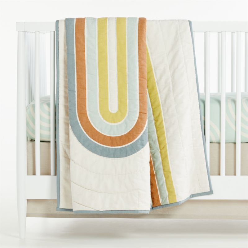 Fun and fashionable, our Linework Crib Quilt has an eye-catching design with curved, multicolored lines and quilted detailing. With muted hues against a cream-colored background, it'll create a dreamy mood. It coordinates with our Linework Toddler Sheet Set, which includes a minty blue crib fitted sheet, flat sheet and toddler pillowcase made from 100% organic cotton.