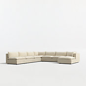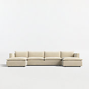 Our popular Lotus four-piece sectional strikes the perfect balance between clean, modern style and cloud-like comfort. Three chairs combine to form an inviting sofa, with a generously proportioned ottoman that switches from left to right for chaise-like lounging. Nestled on a low shelter frames, deeply plush pillows are key to this sectional's lounge-worthy luxury, packed with a fluffy down blend and just the right amount of inner support to look crisp. Just fluff and rotate to keep Lotus company-ready. The Lotus 4-Piece Reversible Sectional with Ottoman is a Crate and Barrel exclusive.