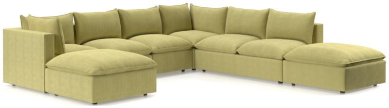 Scaled down to suit smaller-sized spaces, our popular Lotus sectional strikes the perfect balance between clean, modern style and cloud-like comfort. Nestled on a low shelter frames, deeply plush pillows are key to this large sectional's lounge-worthy luxury, packed with a fluffy down blend and just the right amount of inner support to keep it looking crisp. Just fluff and rotate to keep Lotus looking company-ready. The Lotus Petite 7-Piece Low Sectional is a Crate and Barrel exclusive.