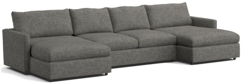 There's a reason it's called Lounge. This double-chaise sectional sofa—part of our ultimate family room collection—features deep, low seats and supersoft back cushions that invite piling on and sinking in. Slim, modern track arms lighten the look and provide maximum sitting space, making the sectional sofa perfect for movie nights or binge-watching your favorite series on TV. Composed of right- and left-arm chaises flanking an armless loveseat, this Lounge Deep three-piece sectional is a Crate & Barrel exclusive.