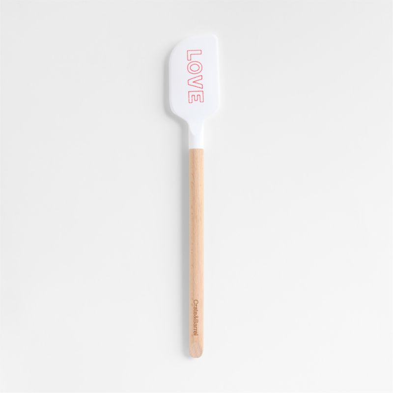 Get every delicious bit of brownie batter, pasta sauce and chocolate ganache with our signature white silicone and wood spatula. Sweetly updated for Valentine's Day with the word "Love" printed in rosy red, the outlined font has the look of embroidery stitches for a homemade Valentine look that we love. The spatula's flexible, tapered edges scrape vessels perfectly clean while resisting stains, scratches and heat. Natural beechwood shapes an elongated handle with a refined beveled edge. This spatula makes a sweet gift for your favorite baker, especially paired with the rest of our coordinating Valentine's Day collection.