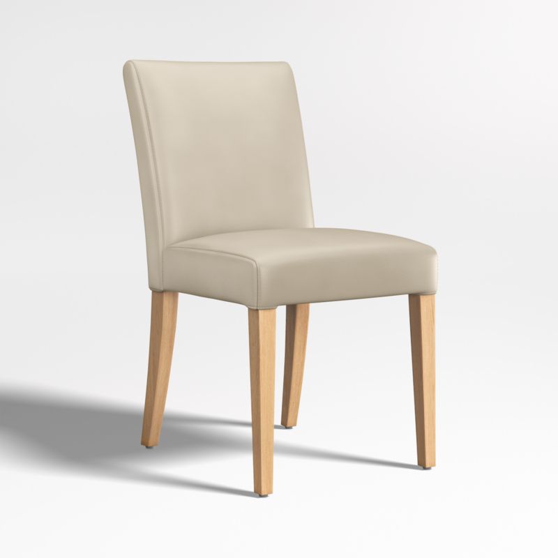 With a roomy cushioned seat and back, our Lowe dining chair is designed for tableside lingering. Sleek off-white leather tailors the cushioned, tight seat in sophistication, partnering perfectly with slim, natural-finished hardwood legs. Our Lowe collection's many seating options in an array of coordinating leathers and fabrics mix and match for the perfect look. The Lowe upholstered leather dining chair is a Crate & Barrel exclusive.