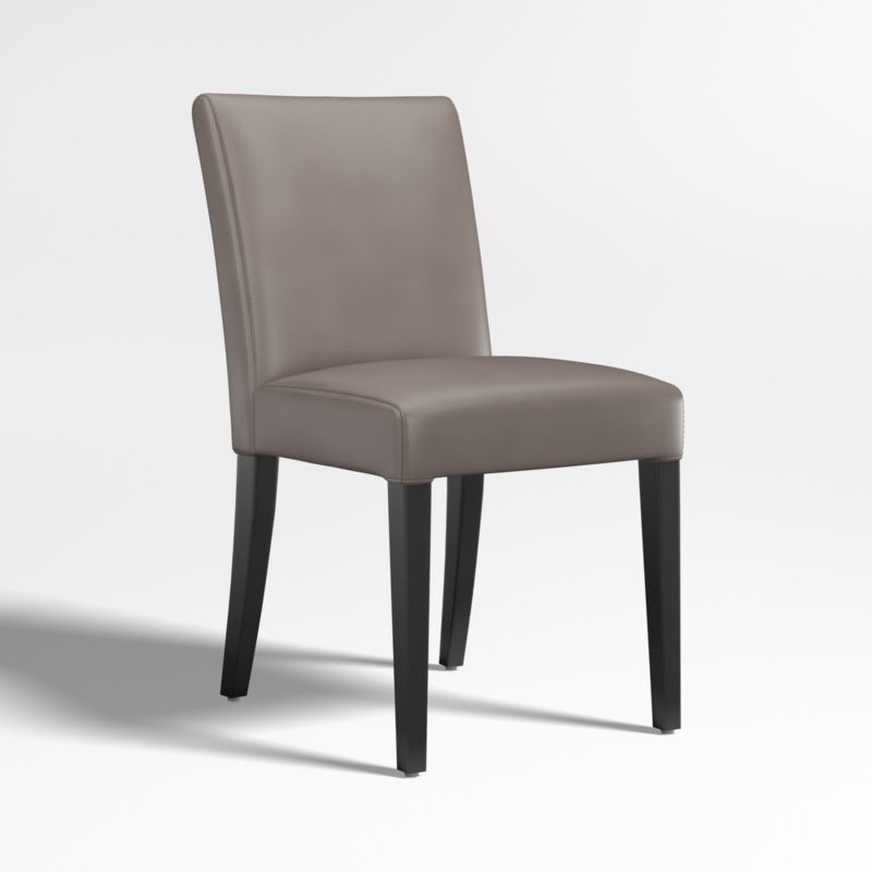 With a roomy cushioned seat and back, our Lowe dining chair is designed for tableside lingering. Sleek grey leather tailors the cushioned, tight seat in sophistication, pairing perfectly with slim, ebony-finished hardwood legs. Our Lowe collection's many seating options in an array of coordinating leathers and fabrics mix and match for the perfect look. The Lowe upholstered leather dining chair is a Crate & Barrel exclusive.