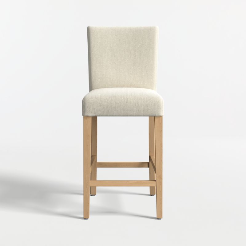 With a roomy cushioned seat and back, our Lowe counter stool is designed for lingering at counters or high-dining tables. Linen-blend ivory upholstery tailors the cushioned, tight seat in sophistication, pairing perfectly with slim, natural-finished hardwood legs. Our Lowe collection's many seating options in an array of coordinating leathers and fabrics mix and match for the perfect look. The Lowe upholstered counter stool is a Crate & Barrel exclusive.
