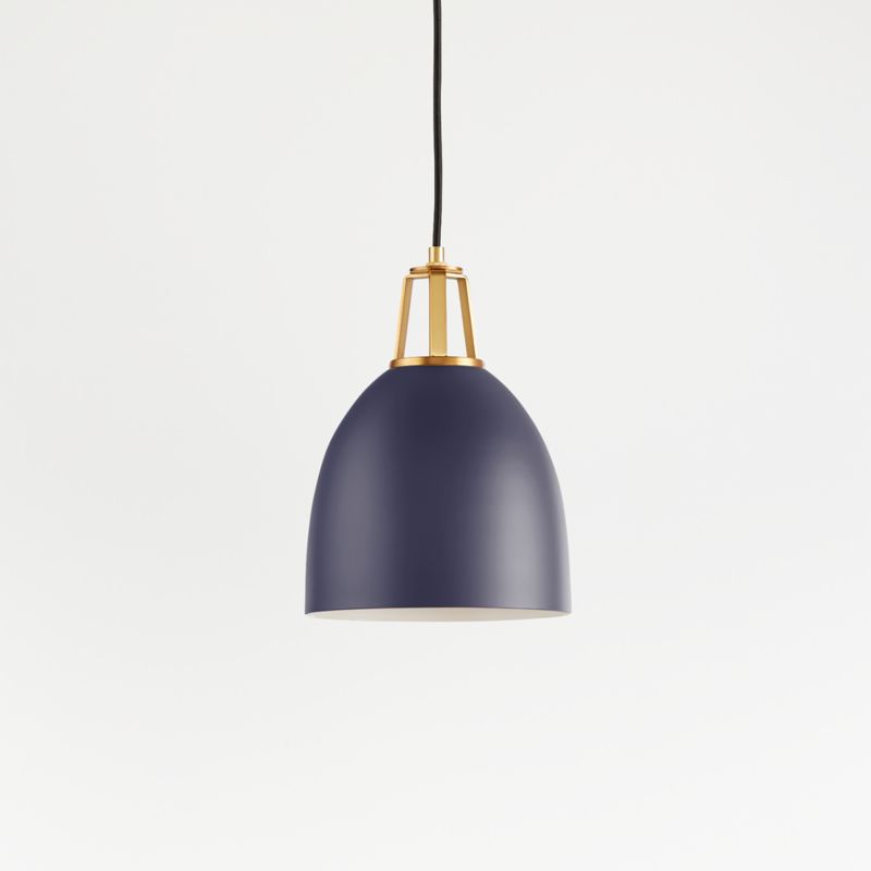 Our Maddox collection mixes and matches finishes and features, creating the perfect combination for your home. Steel shades in a variety of shapes, sizes and modern hues pair matte exteriors and glossy white interiors that reflect light beautifully, accented by decorative socket caps and ceiling plates in a range of finishes. Strikingly simple with bold geometry, this small dome pendant light contrasts a softly rounded matte navy shade with its bright inner surface and brushed brass details. Hang the adjustable-height blue pendant over a kitchen sink, reading chair or bedside table for a colorful, graphic look and useful illumination. Blake Tovin designed our exclusive Maddox collection to be as flexible and functional as the modern home.