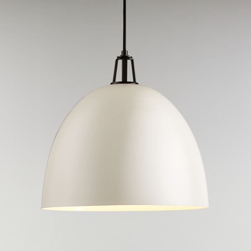 Our Maddox collection mixes and matches finishes and features, creating the perfect combination for your home. Steel shades in a variety of shapes, sizes and modern hues pair matte exteriors and glossy white interiors that reflect light beautifully, accented by decorative socket caps and ceiling plates in a range of finishes. Strikingly simple with bold geometry and black details, this large dome pendant light in matte and shiny white curves softly. Hang the adjustable-height ceiling light over a kitchen island, reading nook or dining table for a clean, graphic look and useful illumination. Blake Tovin designed our exclusive Maddox collection to be as flexible and functional as the modern home.