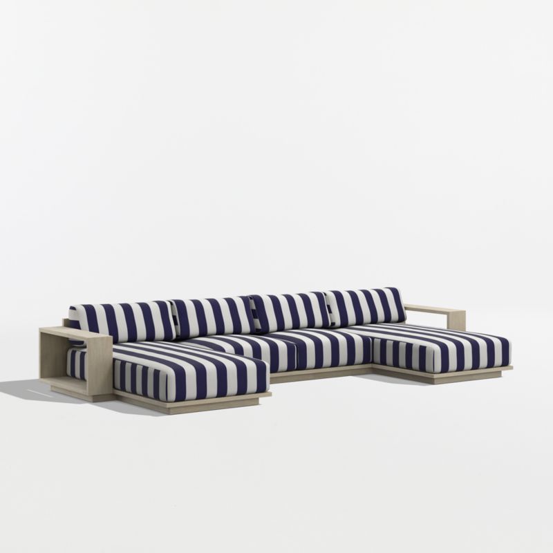 Mallorca Wood Double-Chaise Outdoor Sectional Sofa with Navy and White Cabana Stripe Sunbrella ยฎ Cushions
