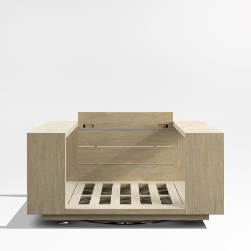 Wide planks of durable, sustainably sourced eucalyptus wood shape Mallorca's bold geometry, while a painted and wire-brushed finish emulates the look of weathered driftwood. The breezy slat frame of this outdoor swivel chair offers generous armrests—the perfect perch for your chilled drink, snack plate or summer read—while the 360-degree swivel makes it easy to enjoy the conversation or the view. Add our all-weather Sunbrella cushions (sold separately) to make this low and loungy swivel chair the ideal spot for soaking up the sun in style.