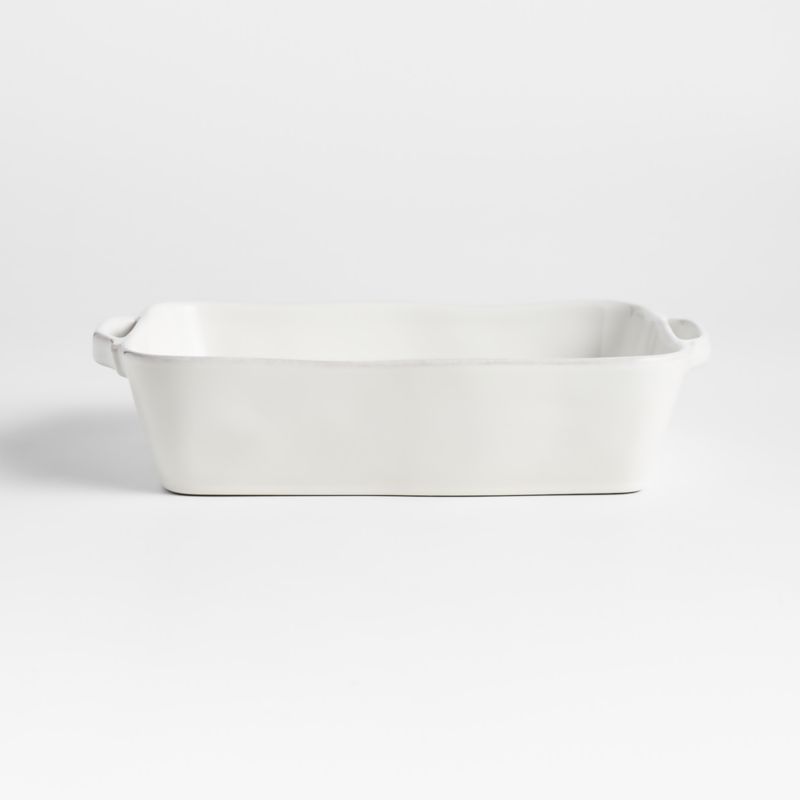 Subtle hand-antiquing on the freeform rim finishes our artisanal ceramic baker glazed in soft white. The unique form suits organic modern tables and is plenty chic for elegant occasions. Made of durable stoneware, the baker is sturdy enough for use every day. Rustic handles carry the medium baking dish easily from the oven to the table, where it beautifully presents gratins and bread puddings. Microwave- and oven-safe, our rectangular baker is also dishwasher-safe for easy cleanup after dinner parties and family meals. For a cohesive dining aesthetic, set a table with our Marin dinnerware and other serving pieces, all Crate and Barrel exclusives. Due to its handcrafted nature, each medium baker will vary slightly.