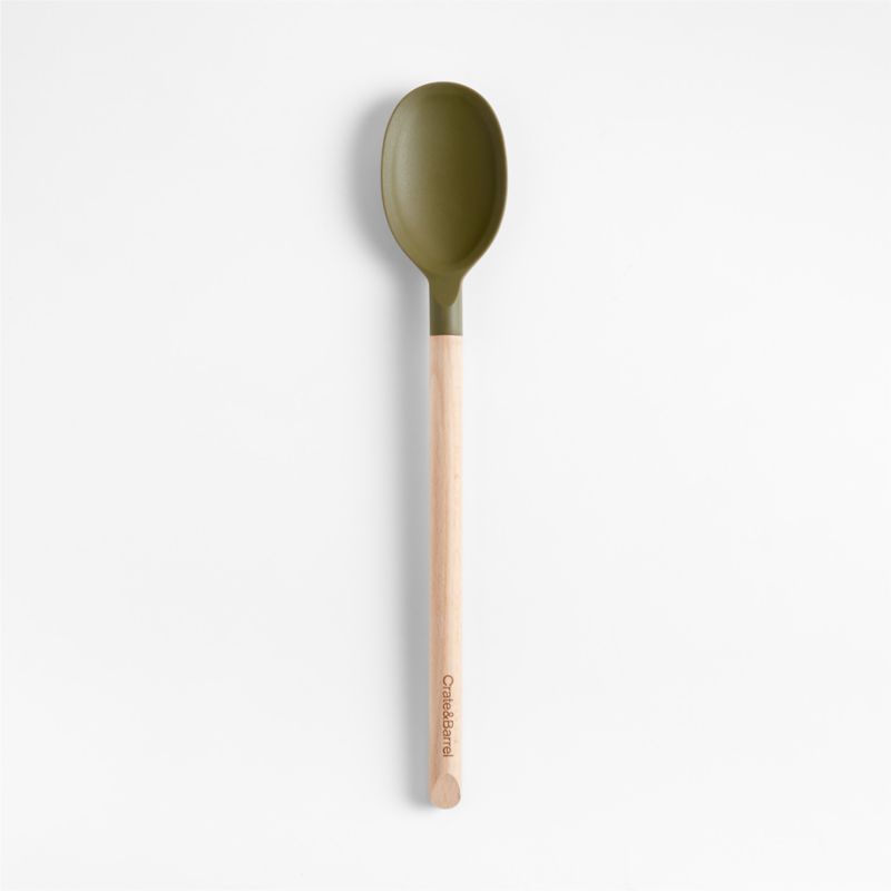 Made to complement our coveted Marin collection, this silicone and wood spoon stirs, scoops and serves. Constructed with a nylon core for strength, the earthy green-brown silicone head ably stirs the thickest doughs or folds the most delicate meringues. Its flexible, tapered edges scrape the bowl, blender or pan perfectly clean, and soft-touch silicone won't damage non-stick cookware and resists stains, scratches and heat up to 450 degrees. Sustainable beechwood shapes a cylindrical handle for a sturdy grip and a warm, classic look, and a refined beveled edge finishes the handle with dynamic detail. Combine the spoon with the other Desert Green utensils, ceramics and table linens in our exclusive Marin collection for coordinated cooking and entertaining.
