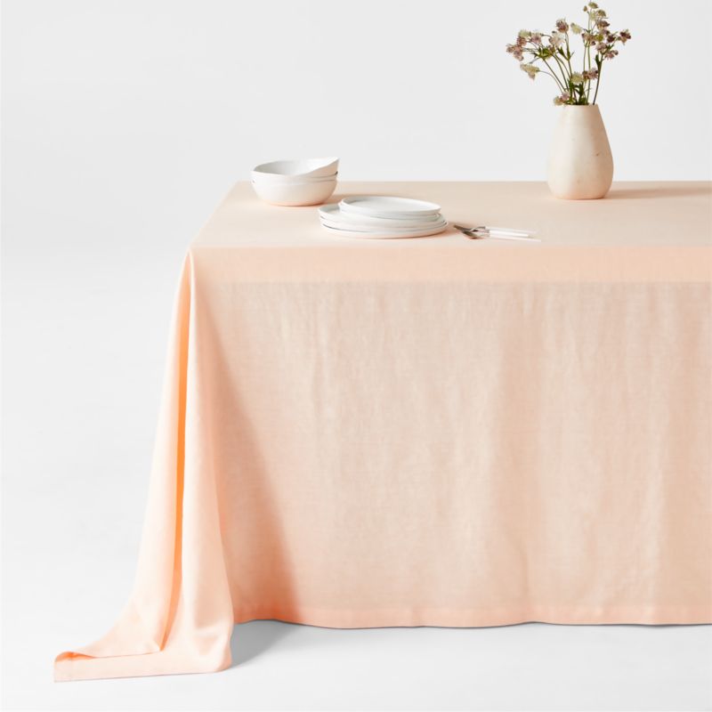 Made of quality European linen, our Marin oversized tablecloth is large enough to cover extra-long tables as well as create elegant floor-length puddles on smaller tables. Soft and supple, the pale pink fabric pairs effortlessly with dinnerware in a range of hues. Each pastel pink tablecloth is pre-washed for extra softness and tailored with two-inch hems and mitered corners to keep the look crisp and neat.