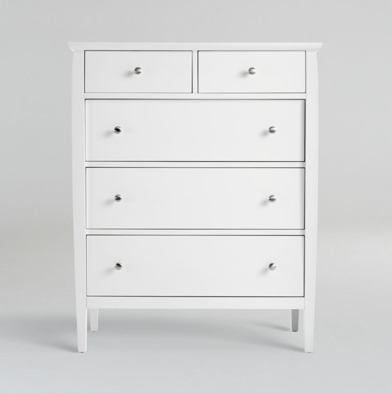 The Mason five-drawer dresser balances clean lines with a fresh white finish while delivering plenty of room for bedroom storage. The chest sits high on legs that take a turn with tradition, flowing right into the frame and curving in at the top.