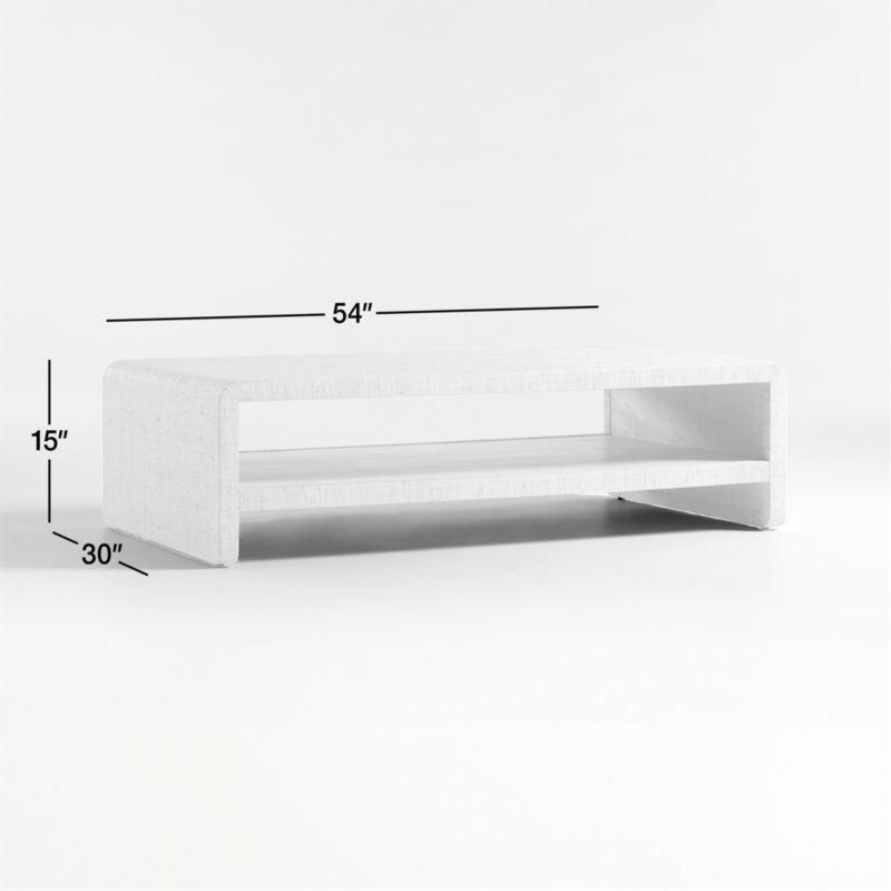 Waterfall edges and natural fiber give our Meadow coffee table its casual, coastal vibe. Handwoven grasscloth cloaks every line and curve of the table's exterior in a wealth of variegated natural color and organic texture. Glimpses of the wood frame on the interior enrich Meadow's appeal with material contrast. Flowing a seamless U-shape, the coffee table floats a single open shelf for storing magazines, coasters or remotes. The Meadow grasscloth coffee table is a Crate & Barrel exclusive.
