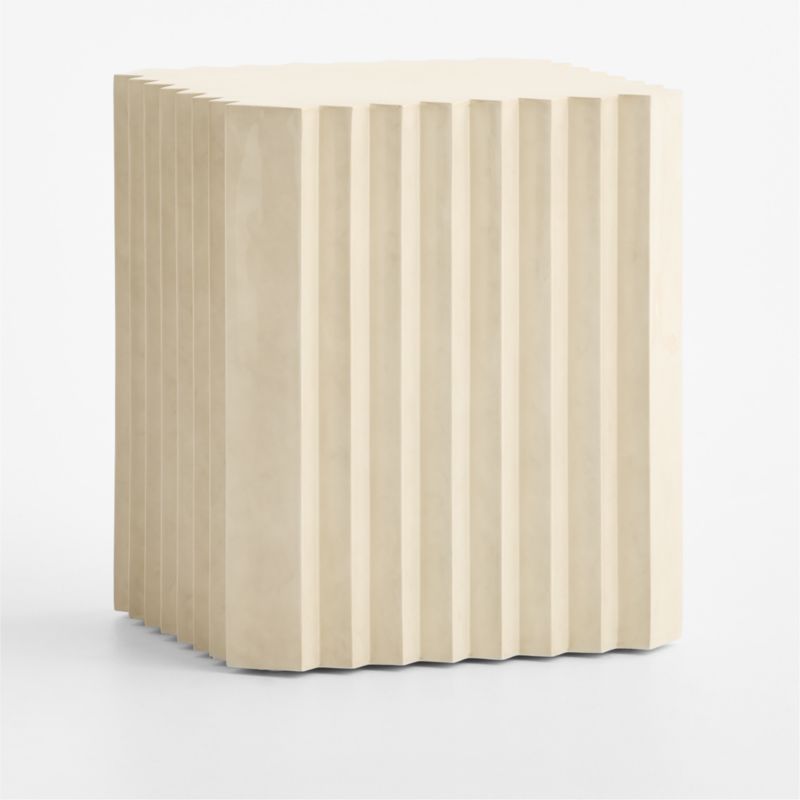 A contemporary classic, our Medida end table grabs attention with its monolithic stance, architectural styling and striking view from any angle. A bird's-eye view presents a square with marquis ends, which, when seen from the side, reveal themselves as substantial diamond-shaped, deeply fluted columns. Adding to its rustic Mediterranean vibes, the accent table is finished by hand to resemble tadelakt, a time-honored plaster technique with roots in Morocco that offers a neutral, slightly textured finish with beautiful tonal variations.
