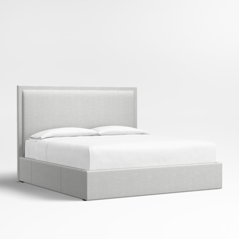 Our custom bed collection lets you mix and match our top-selling headboards and bases for a look that's truly yours. A tight border sets off the plush pillowed face of the Meraux headboard for a tailored update on a bedroom classic. The base integrates three roomy drawers—one on each side and one at the foot of the bed—for storing off-season clothes and extra blankets. As a plus, the side drawers open with just enough clearance to avoid hitting nightstands and other bedroom furniture. Both pieces are upholstered in a linen blend in cool grey.