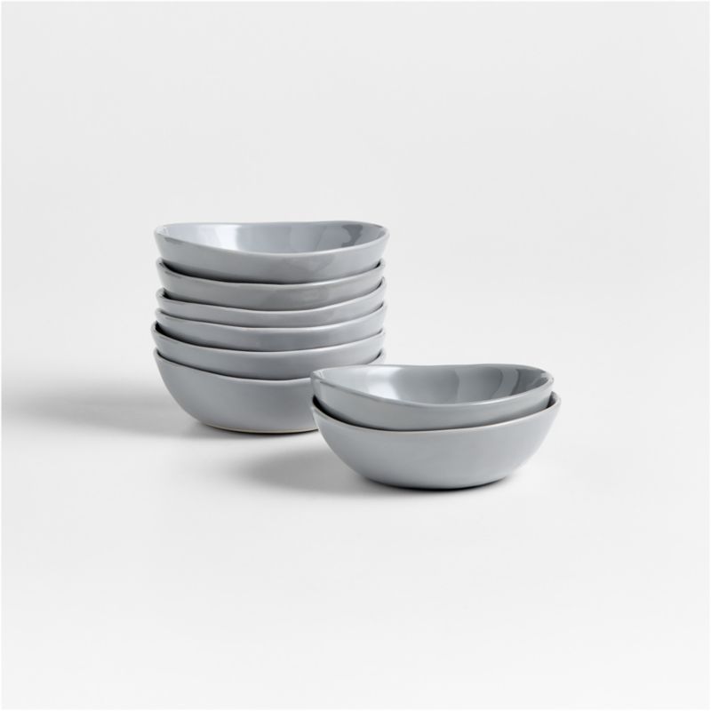 Our contemporary porcelain dinnerware sets a table of refinement and rusticity. Perfect for desserts or snacks, this set of eight small bowls takes on organic overtones with freeform rims and finely "hammered" surfaces that ripple the light. Made of grey-glazed natural clay, the mini bowls may vary slightly in color. Smooth enough to not harm tables, the unglazed ceramic bottoms give each piece an artisanal look.