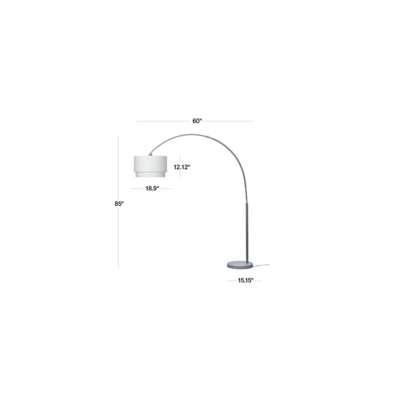 The arc floor lamp goes over and above modern expectations, suspending a geometric two-tier shade in crisp white cotton blend from a satin nickel-finished arch. Round white marble base adds a classic touch.