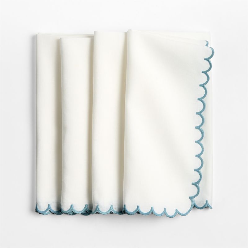 Woven of a linen and cotton blend, these ivory napkins delight with scalloped borders. Satin-stitch embroidery trims the edges in soft blue, giving the napkins a fanciful feel.