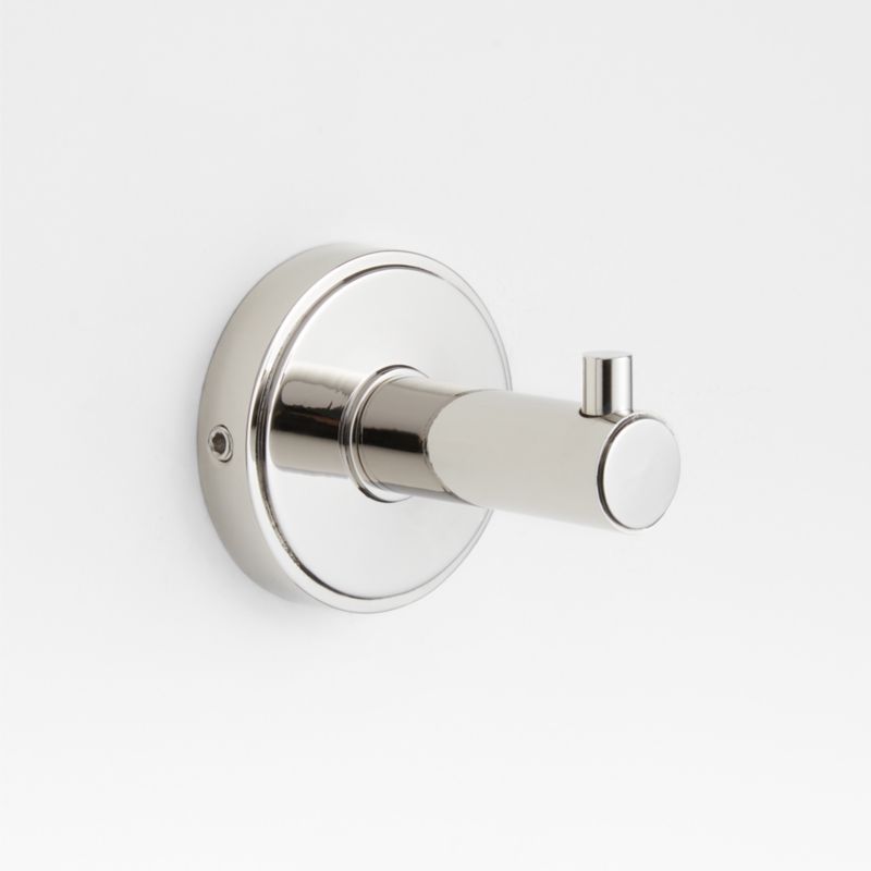 Sometimes it's the small things that pull a room together. That's why we've designed a hardware collection with modern silhouettes and a touch of tradition to give your bathroom that perfect finishing touch. Grooved detailing and a shiny chrome finish lend an industrial vibe to this towel hook. Constructed of brass as a series of cylinders, the hook has an understated geometry that we love. Provided hardware makes it easy to refresh the look of bathrooms and powder rooms.