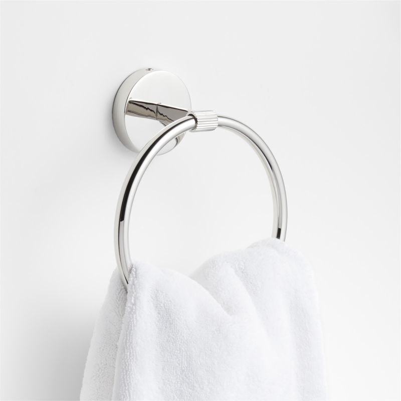 Sometimes it's the small things that pull a room together. That's why we've designed a hardware collection with modern silhouettes, clean lines and a touch of tradition to give your bathroom that perfect finishing touch. Made of brass and finished in shiny chrome, this towel ring lends industrial chic to its minimalist design. The towel holder threads a perfect circle through a fluted tube that extends from a flat bar anchored to a circular mount for an intriguing mix of rounded edges, smooth surfaces and texture. The hand towel ring easily fastens to the wall with included hardware.