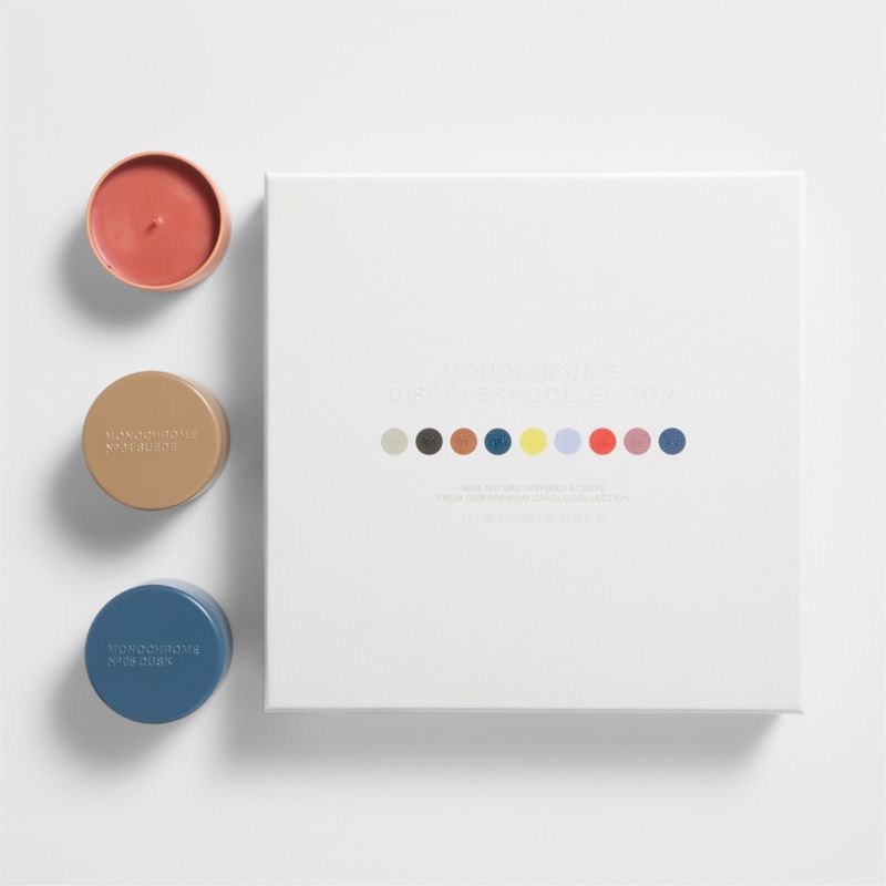 Utterly modern in a dozen monochromatic hues. This gorgeous set gathers nine of our signature Monochrome candles in a gift-ready box. Each beautifully scented votive candle—the fresh zest of No. 1 Blanc, the rich earthiness of No. 5 Dusk and so many more—features a colorful metal tin filled with wax in the same color. Give the gift to the candle collector in your life or sample it yourself to find your favorites.