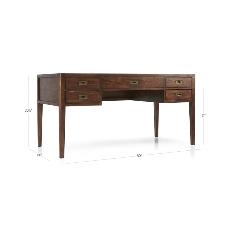 The desk provides ample storage, with a large middle drawer and two stacks of smaller drawers. The Morris 60" Chocolate Brown Desk is a Crate and Barrel exclusive.