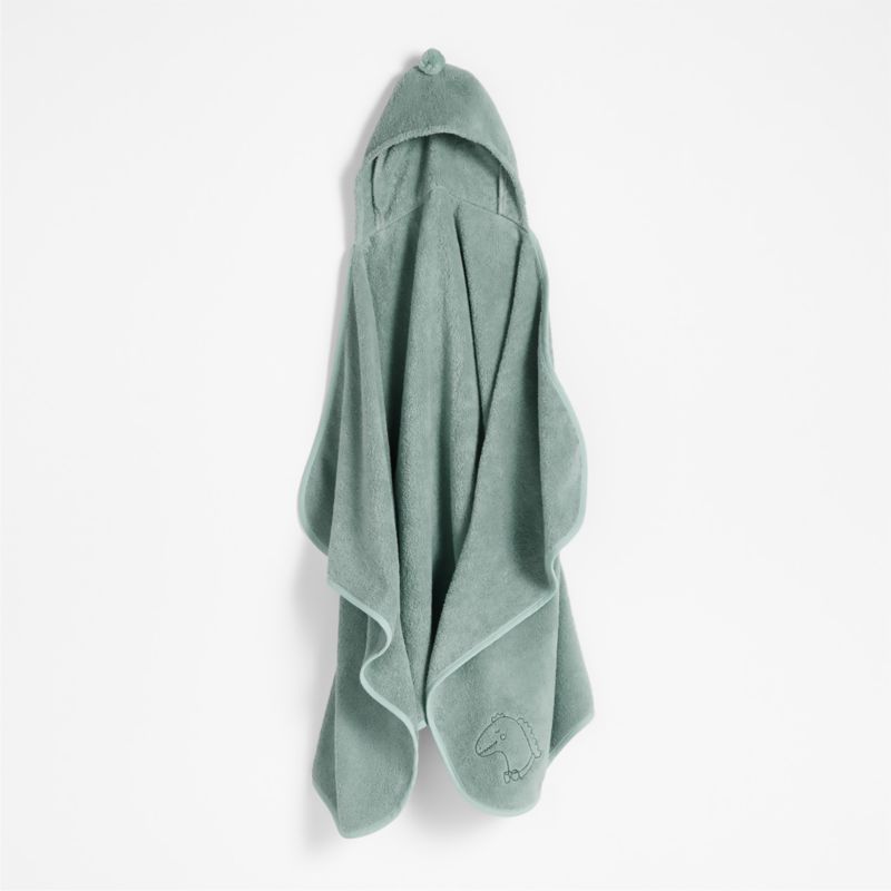 Made 100% organic cotton, our Nachi hooded kids towel features delightful embroidery of a dapper dinosaur wearing a bowtie. The blue towel's terry pile is soft, absorbent and ever-so gentle on sensitive skin, and the edges are reinforced with smooth cotton trim for added durability. A tufted tassel tops the hood. Pair the hooded kids towel with the blue Nachi washcloths for a coordinated look or a thoughtful gift.