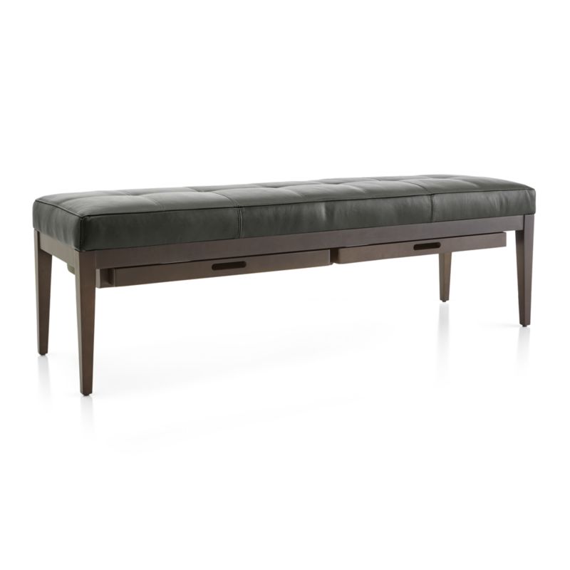 Nash not only provides extra seating for guests, this entertainment-ready bench helps with serving, tucking two removable trays under its cushioned top. With its clean lines and sleek leather upholstery, the roomy bench also sits pretty at the end of a bed, or as an ottoman or coffee table. The Nash Leather Tufted Large Bench with Tray is a Crate and Barrel exclusive.