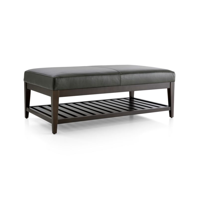 Parked in front of a sofa or sectional, this rectangular ottoman doubles up as an extra seat or cocktail table. Neatly tailored with topstitching, the leather-upholstered ottoman offers a slotted shelf for books or baskets. Nash's clean lines and soft leather texture bring warmth and style to the casual living room.The Nash Leather Rectangular Ottoman with Slats is a Crate and Barrel exclusive.