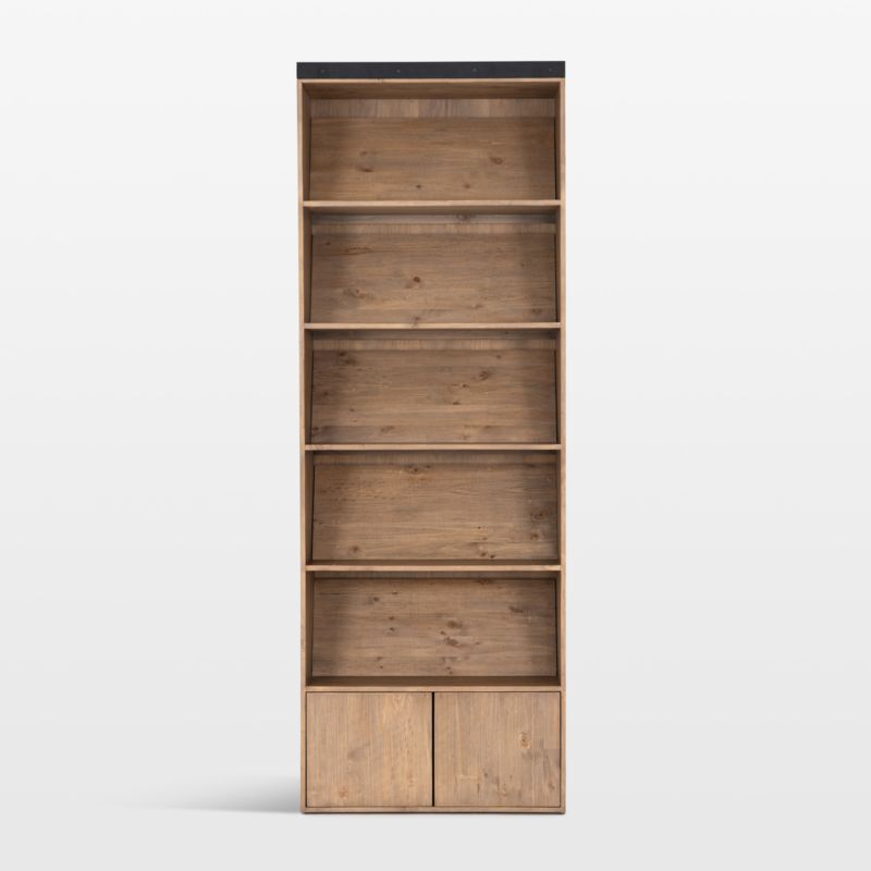 Tall and clean-lined, our Natasha bookcase shows off the beauty of solid pine with a smoked finish. The bookcase offers four fixed shelves and a lower closed cabinet with flat door fronts to show off the wood grain. Each shelf has a removable ledge slanted at an angle for library-worthy display of coffee table books and framed artwork. A bolted, black-finished iron rail at the top adds contrast and a touch of industrial panache. For expanded storage, pair the bookcase with the coordinating Natasha bookcase with ladder.